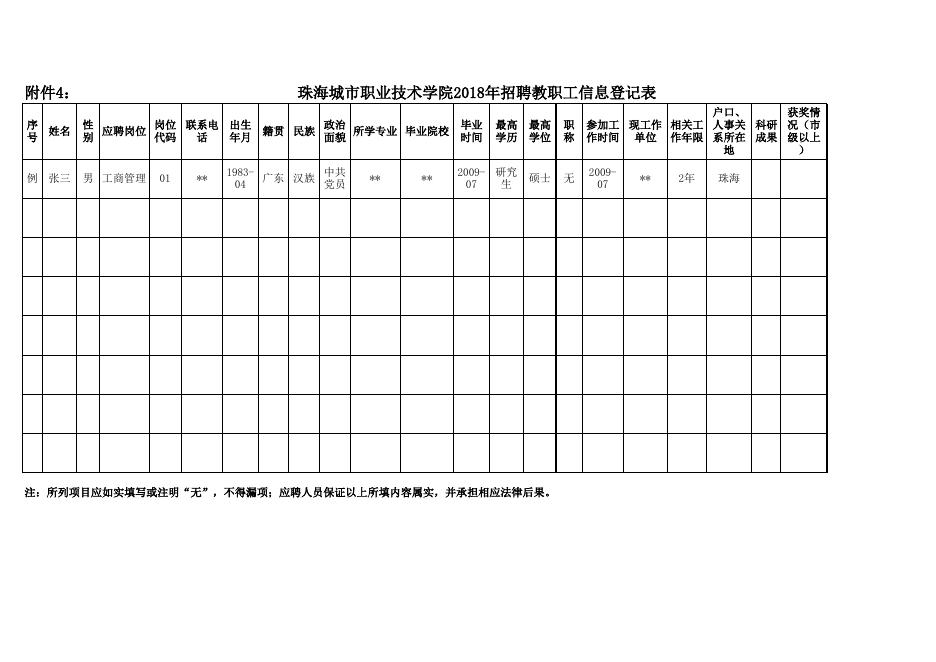 附件4:珠海城市职业技术学院2018年招聘教职工信息登记表.xls