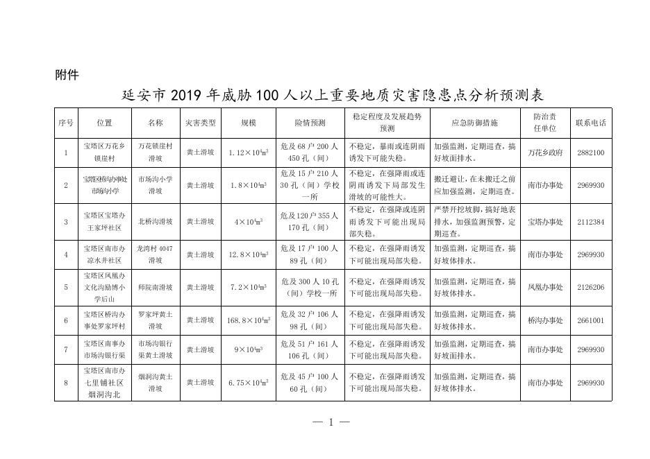 附件:延安市2019年威胁100人以上重要地质灾害隐患点分析预测表.doc