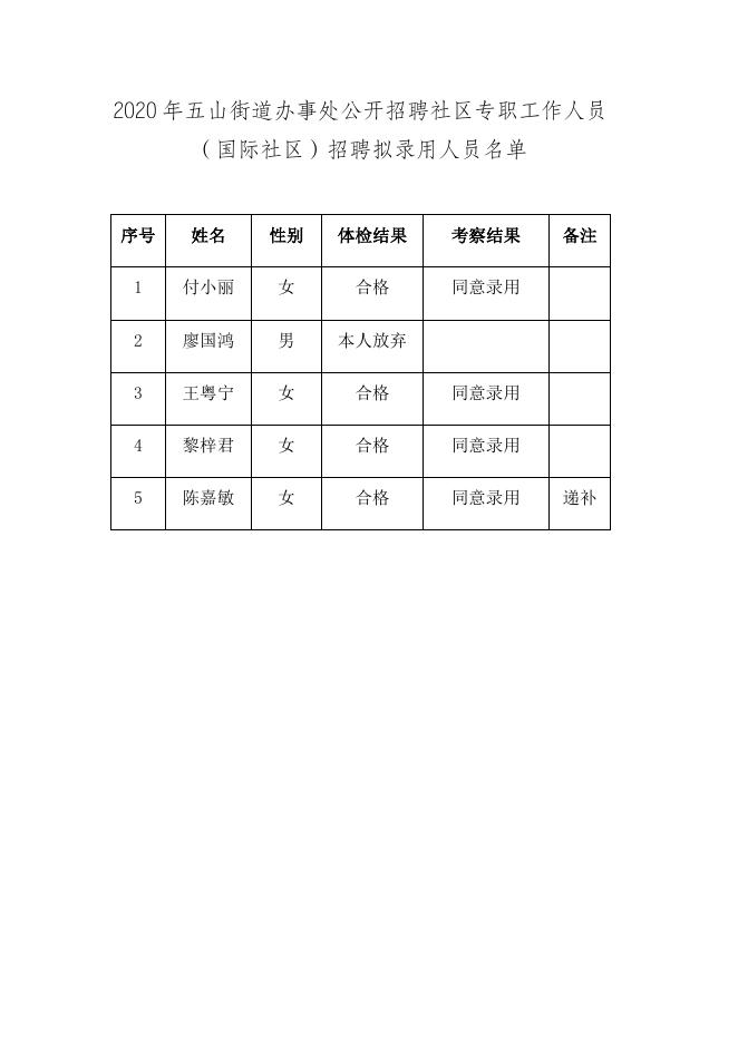 2020年五山街道办事处公开招聘社区专职工作人员(国际社区)招聘拟录用人员名单.docx