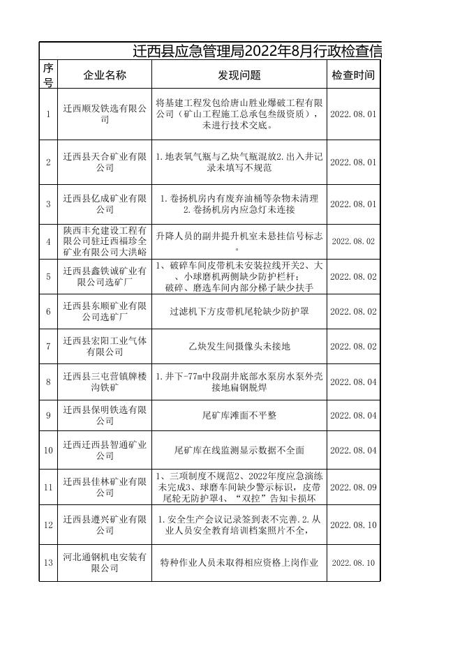 迁西县应急管理局2022年8月份行政检查信息表.xlsx