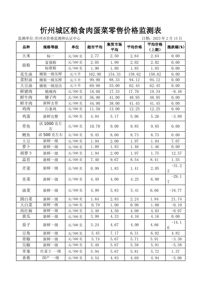 忻州城区粮食肉蛋菜零售价格监测表2023.2.15.docx
