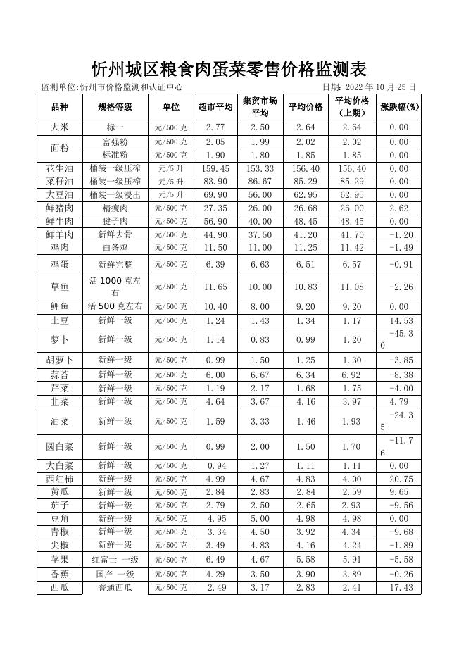 忻州城区粮食肉蛋菜零售价格监测表2022.10.25.docx