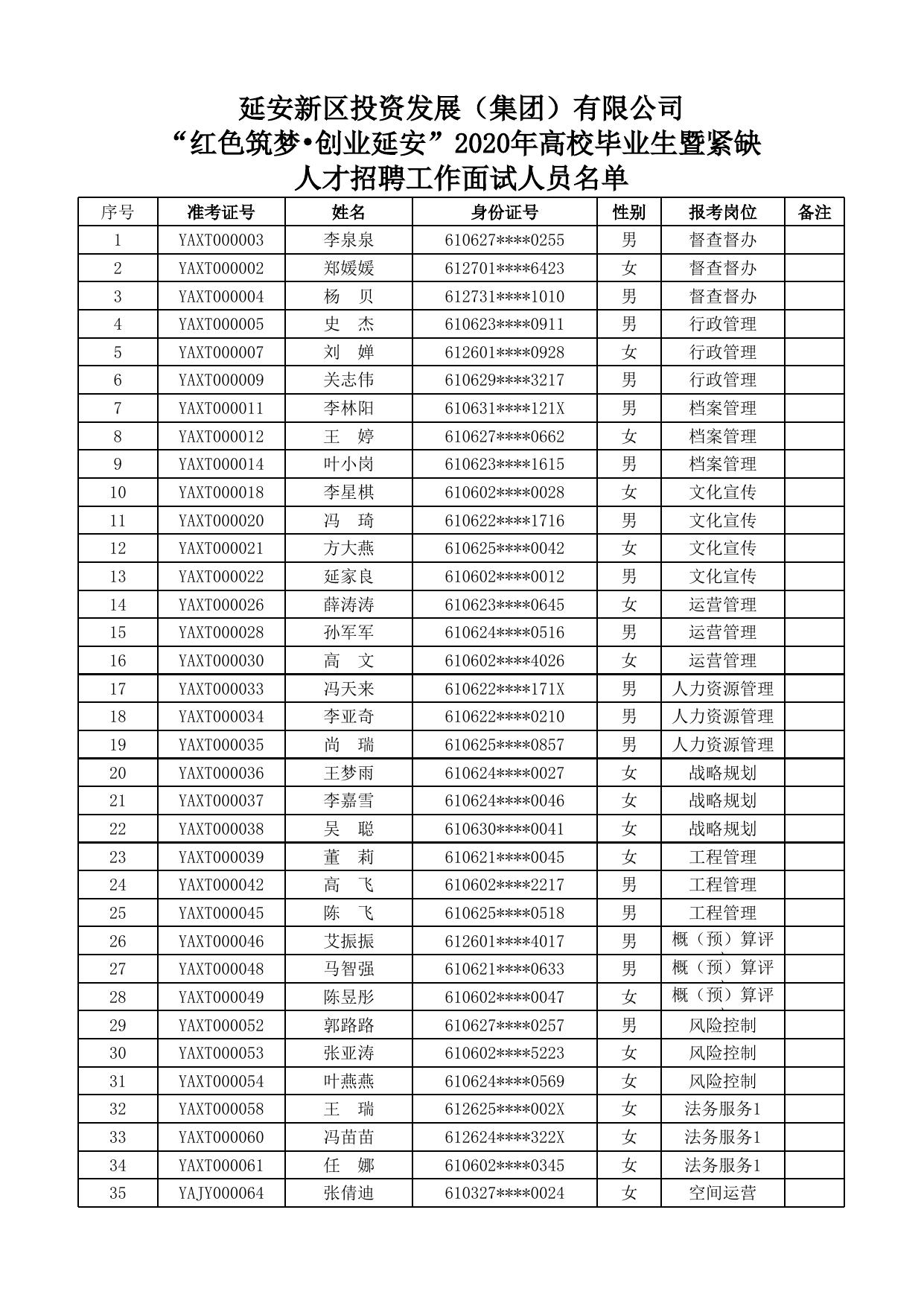 延安新区投资发展(集团)有限公司“红色筑梦•创业延安”2020年高校毕业生暨紧缺人才招聘面试人员名单.xlsx