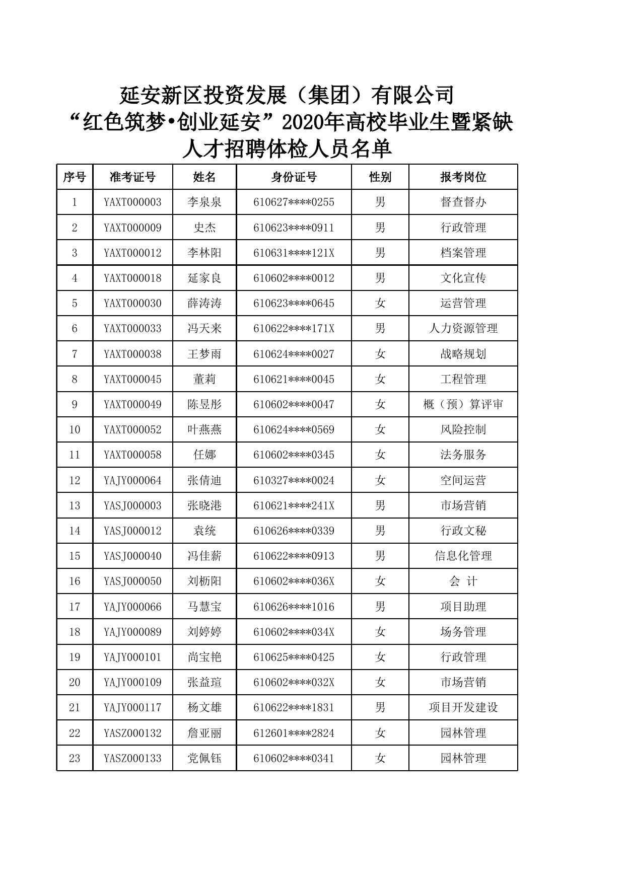 延安新区投资发展(集团)有限公司“红色筑梦•创业延安”2020年高校毕业生暨紧缺人才招聘体检人员名单.xlsx