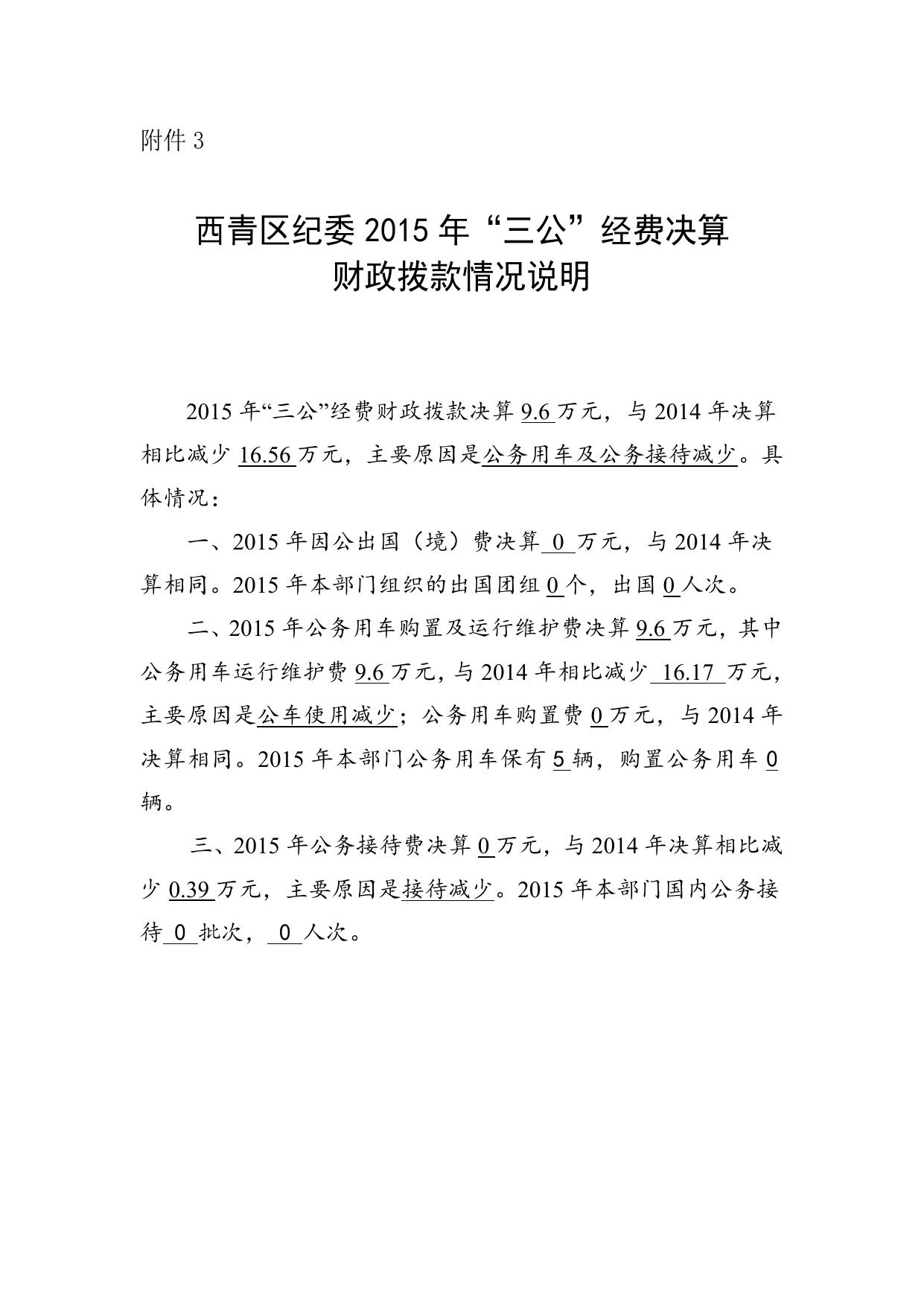 附件3:西青区纪委2015年“三公”经费决算财政拨款情况说明.doc