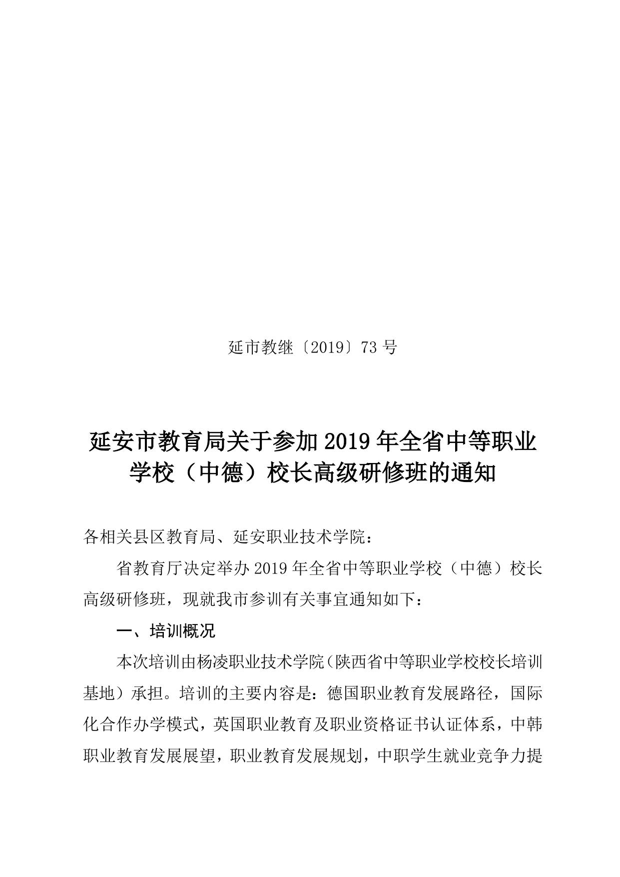 延安市教育局关于参加2019年全省中等职业学校(中德)校长高级研修班的通知.doc