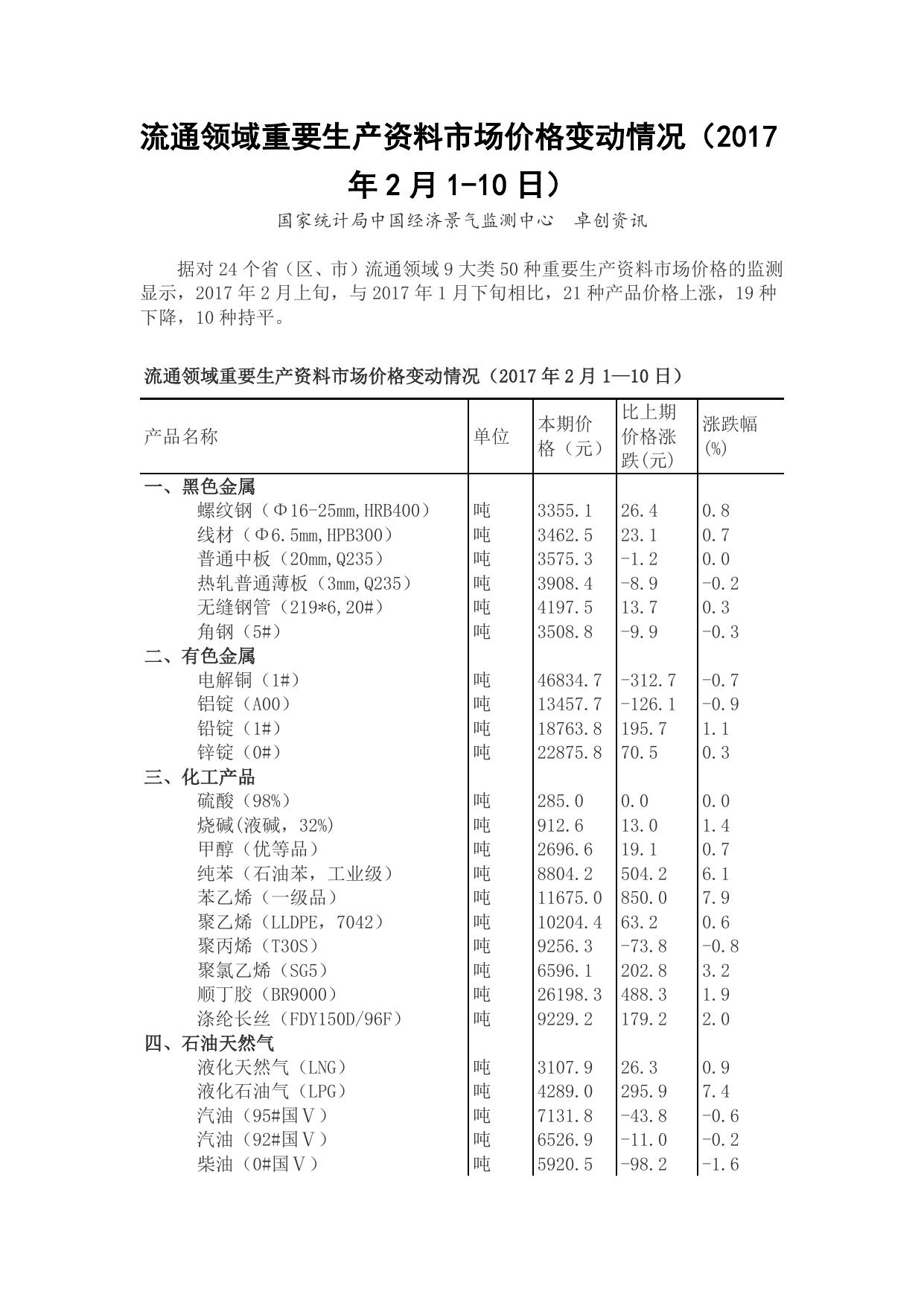 流通领域重要生产资料市场价格变动情况(2017年2月1-10日).doc