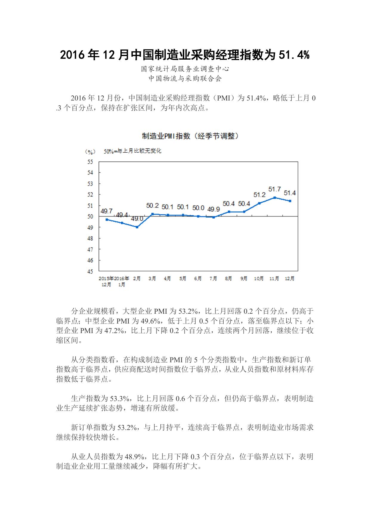 2016年12月中国制造业采购经理指数为百分之51.4.doc